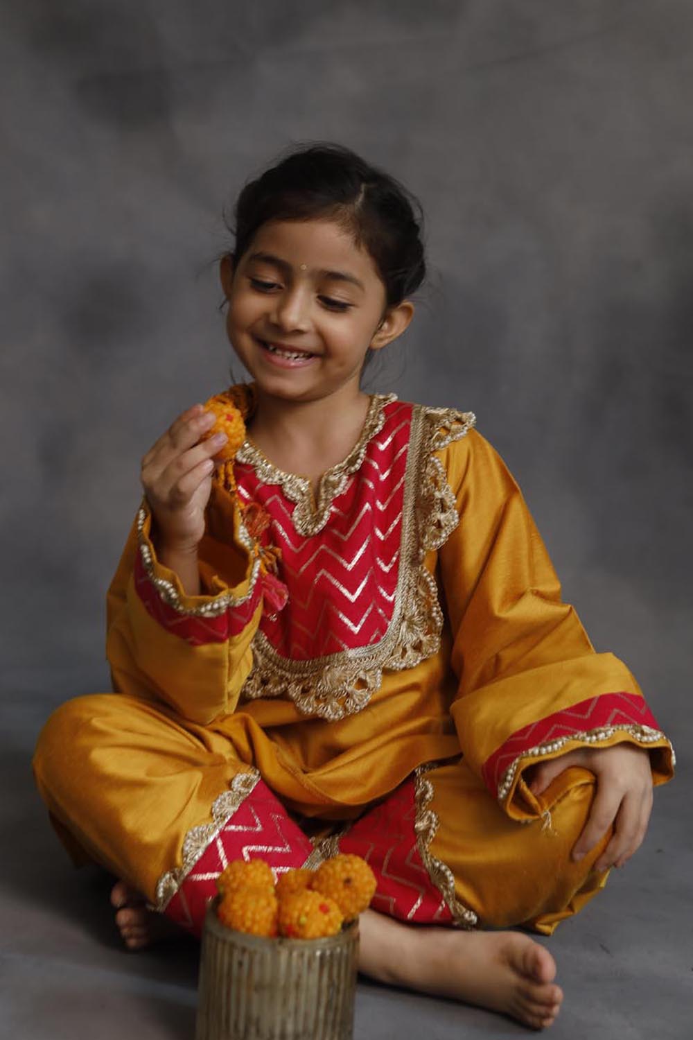 An asymmetrical hemline Kurta with a contrasting pink chevron appliqued yoke finished with rich dull gold borders. The applique continues on the sleeve and the bottoms too. Relaxed fit . Kurta has a zipper.